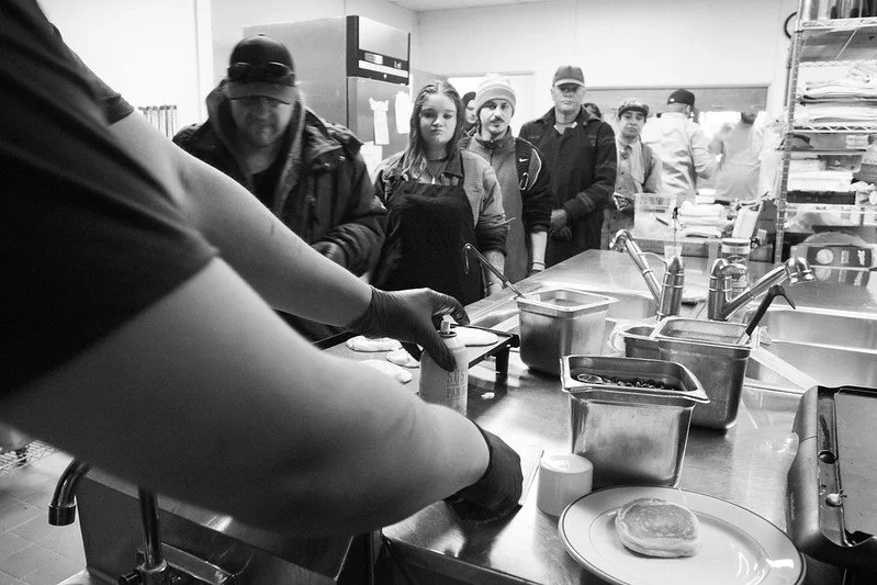 A number of individuals currently experiencing homelessness organized a Pancake Party and spread the word to the whole community. They prepared, welcomed guests, helped cook a delicious hot breakfast, and cleaned up.